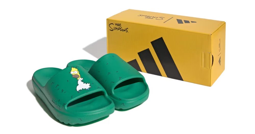 En 2026, la marca decidió profundizar en esa línea con las Homero Simpson x adidas Adilette Slide. El diseño no se limitó a estampar el gráfico del meme en la parte superior: las sandalias adoptan el característico verde de los arbustos, integran el logo de Los Simpson junto al de adidas y vienen en una caja amarilla que evoca el universo visual de la serie. El producto, comercializado a 50 dólares, refuerza la idea de que los memes pueden convertirse en mercancías con valor simbólico además de funcional.