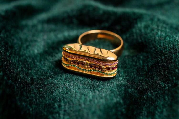 La pieza central de esta estrategia es el «Subway Baguette Ring», un anillo chapado en oro de 18 quilates que reinterpreta la estética de un sándwich a través de la joyería. Lejos de ser un simple accesorio con el logotipo de la marca, la pieza es una representación meticulosa del sándwich Classic B.M.T. (Biggest, Meatiest, Tastiest). En lugar de una sola piedra preciosa, el anillo presenta tres franjas de gemas cuidadosamente seleccionadas: zafiros, zafiros rosas y rubíes. Esta disposición en capas no es casual; busca evocar visualmente los tres tipos de carne (pepperoni, salami y jamón) que caracterizan a este producto estrella, convirtiendo un alimento cotidiano en un símbolo de estatus y afecto.
